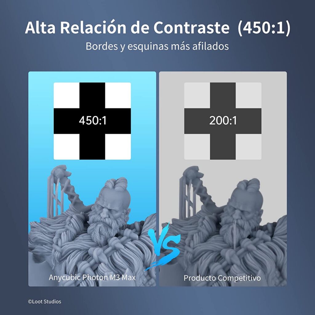 Por último, la Anycubic Photon M3 Max garantiza detalles nítidos en cada impresión. Su relación de contraste de hasta 450:1, un 125% más alta que otras impresoras de resina, mejora los detalles y asegura resultados de alta calidad.